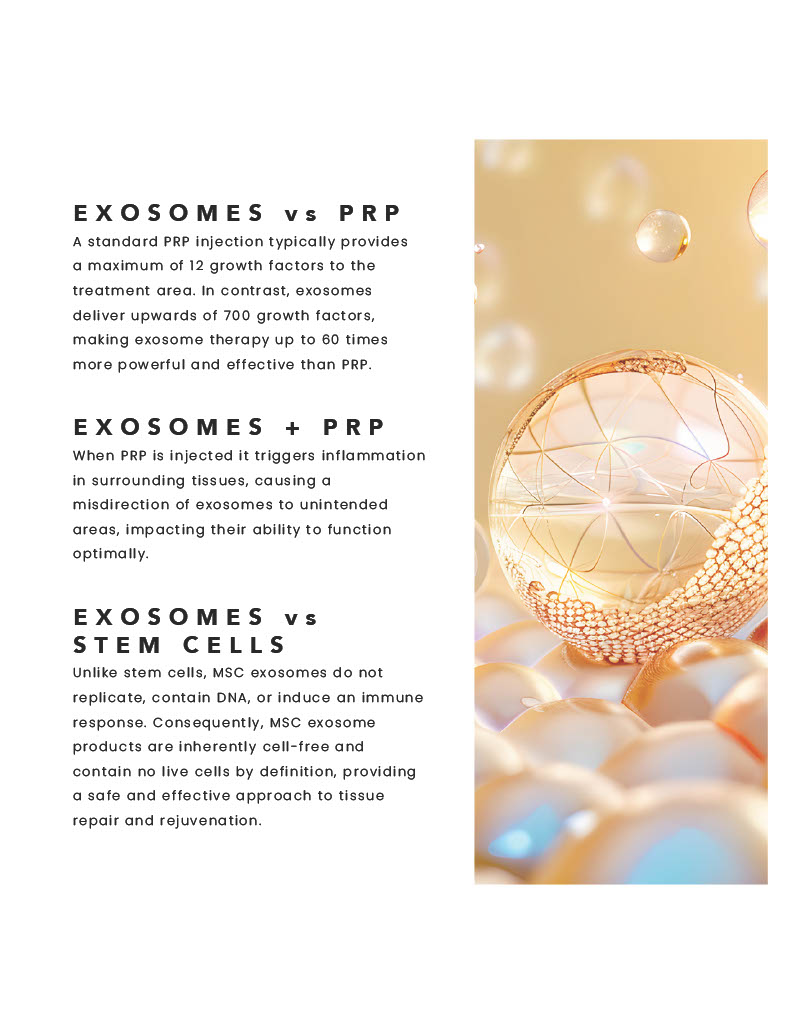 Unlike live stem cells, exosomes are completely cell-free and contain no DNA. They don’t replicate in the body, making them a safe, non-tissue alternative for promoting healthier, more youthful-looking skin. Our exosomes are sourced from high-quality WHARTONS Jelley from the umbilical cord and are produced in a sterile, controlled lab environment that meets rigorous cGMP (Current Good Manufacturing Practice) standards.